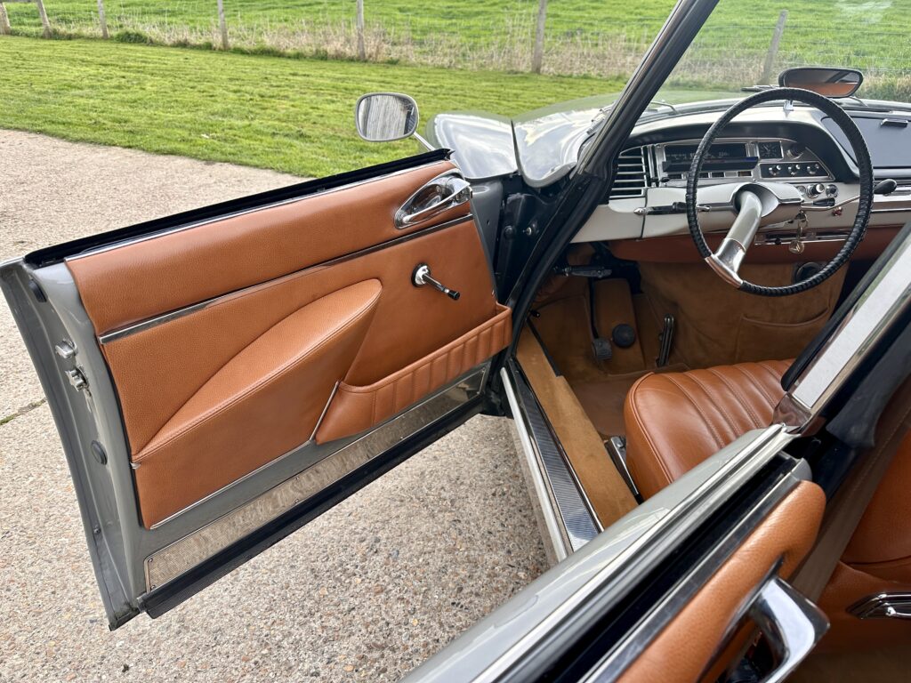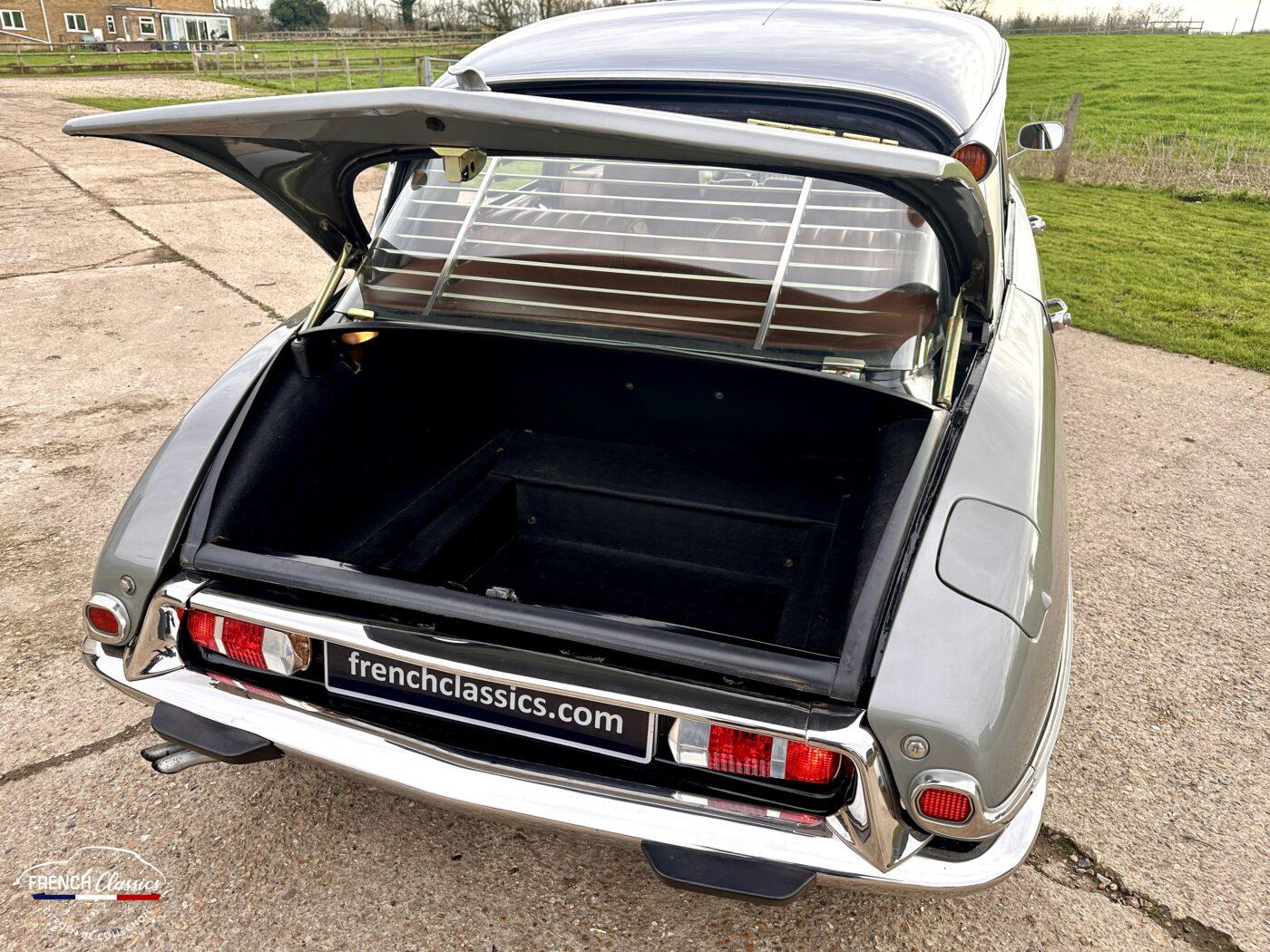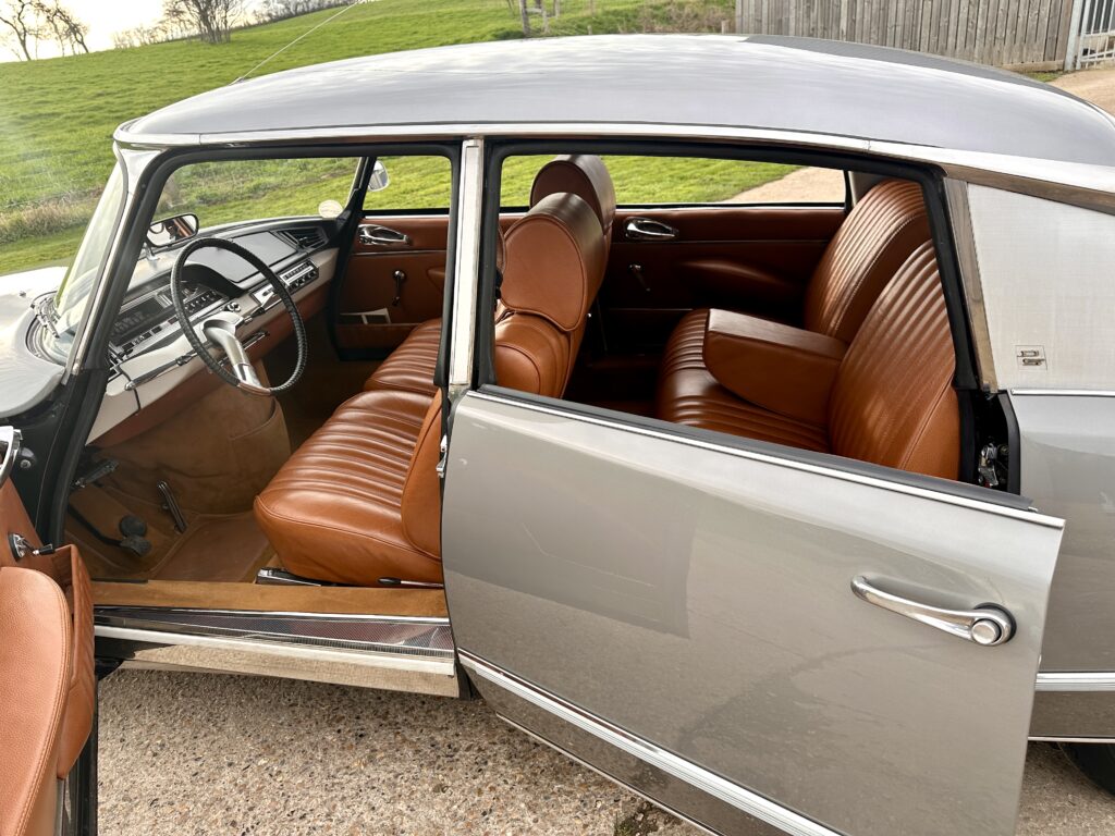 LHD, Palladium grey metallic with silver roof, light brown leather interior with specific matching headrests,”Gradulux” style rear blinds, 1968 dashboard with period “Continental Edison” radio fitted, manual gearchange, restored in 2018 together with repolished chrome bumpers, powder coated wheels, new carpets and new leather + headlining. Stunning Citroen DS Pallas with the desirable early dashboard and swivelling headlamps. Sold with UK MOT, service history and original DS handbook (picture: Frank Stevenson, Car designer with his new car)